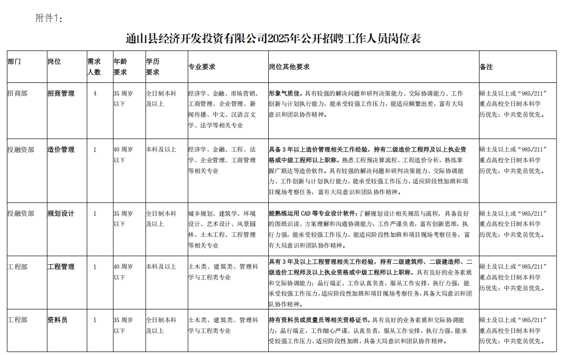 附件1:《通山县经济开发投资有限公司2025年公开招聘工作人员岗位表》