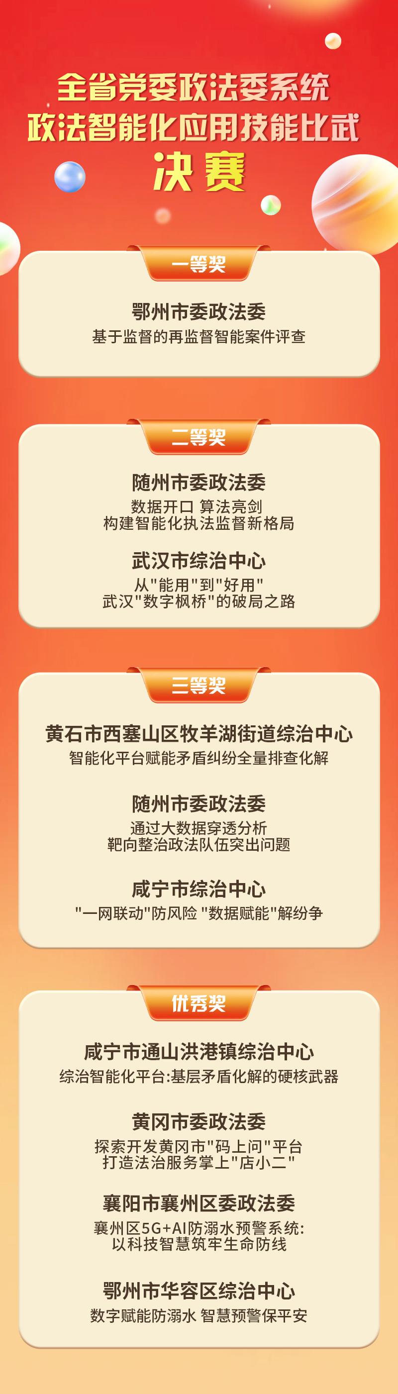 云上通山报道:1月16日,全省103个县市1260多个乡镇经两个多月多轮角逐,最后决赛,洪港镇智能化综治案例作为全省唯一乡镇,代表咸宁市参加决赛获全省优秀奖!(详见海报)。