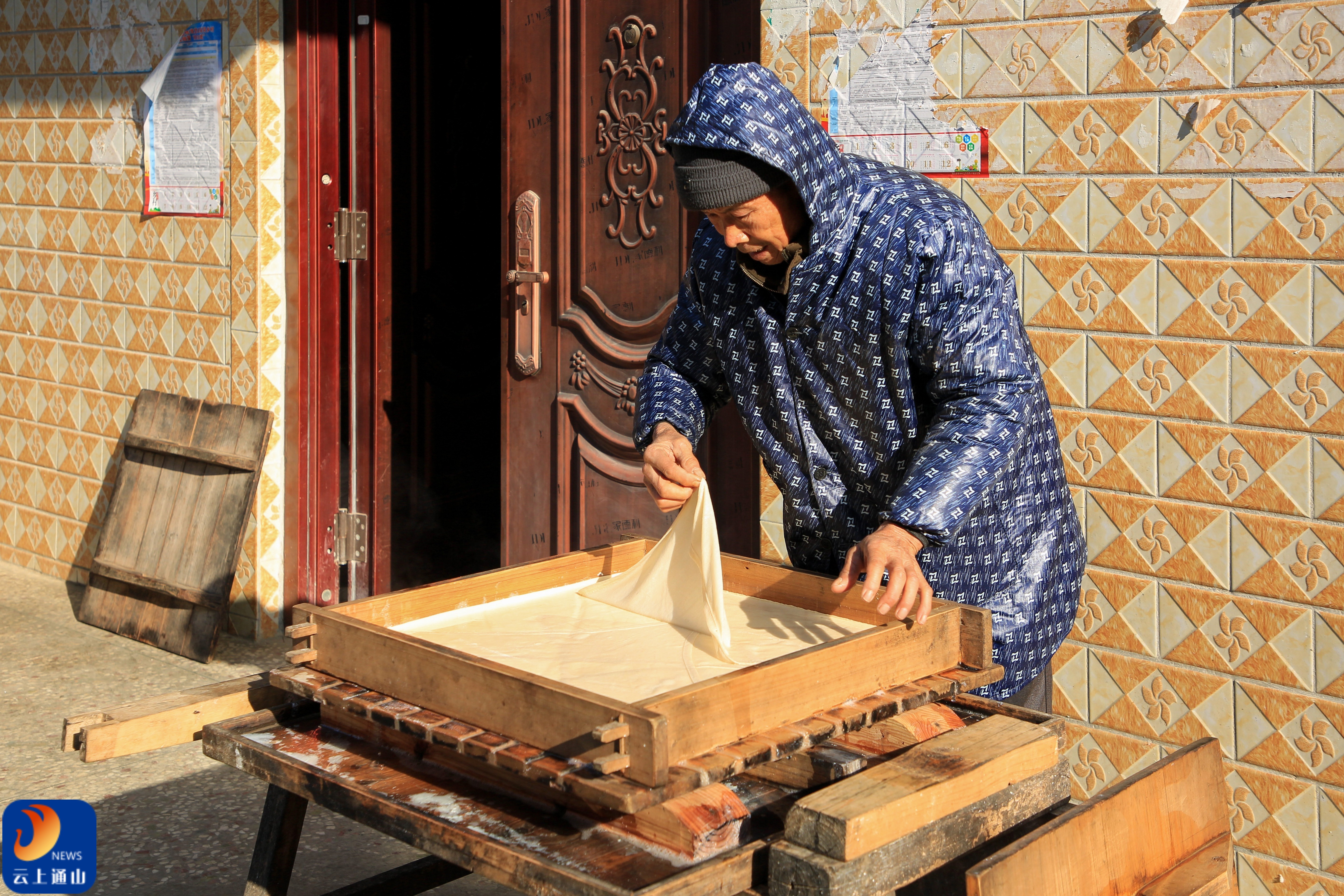 ▲晨光里的木框摊浆,揭开布巾的瞬间,豆浆在竹匾上泛着温润的光泽。