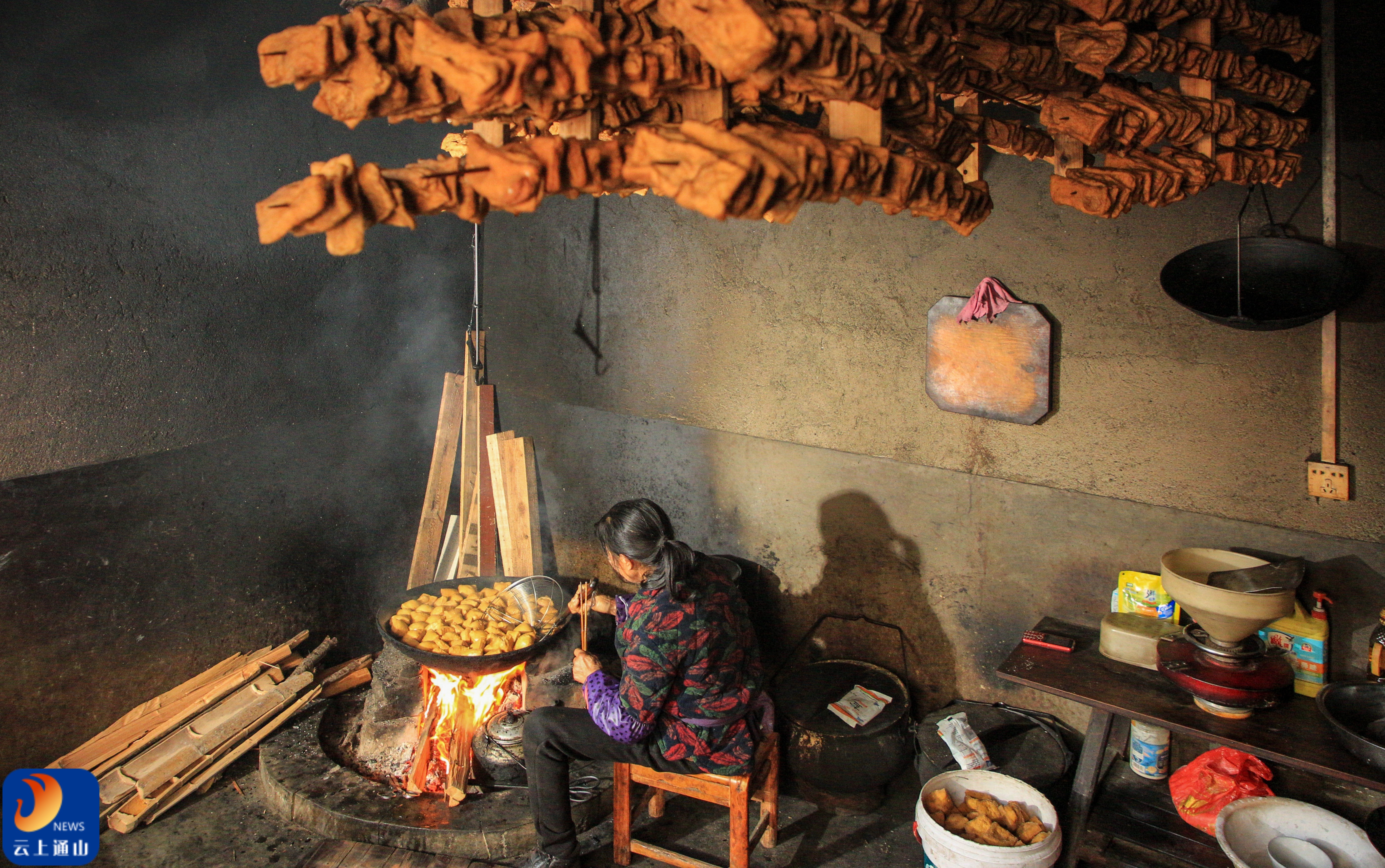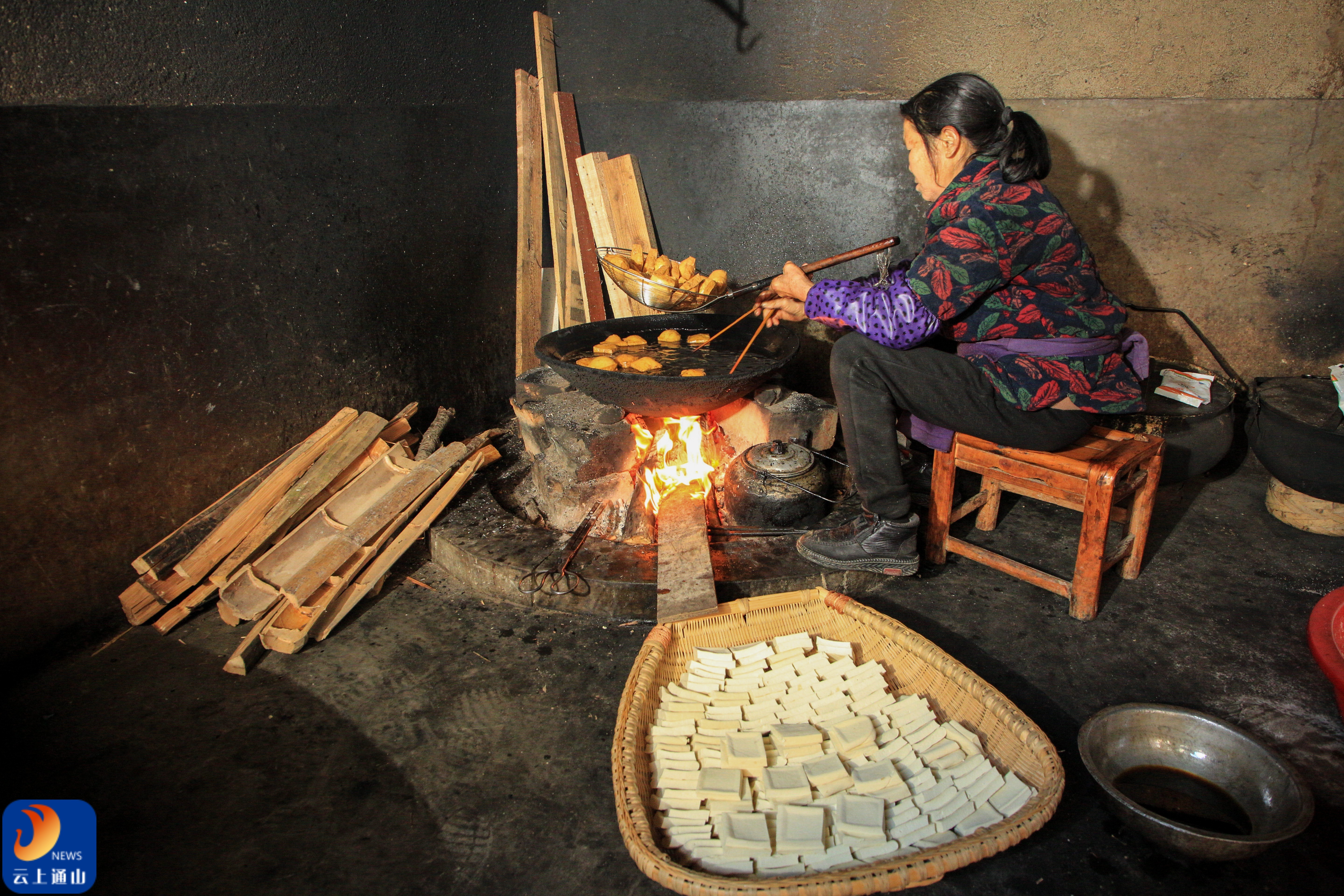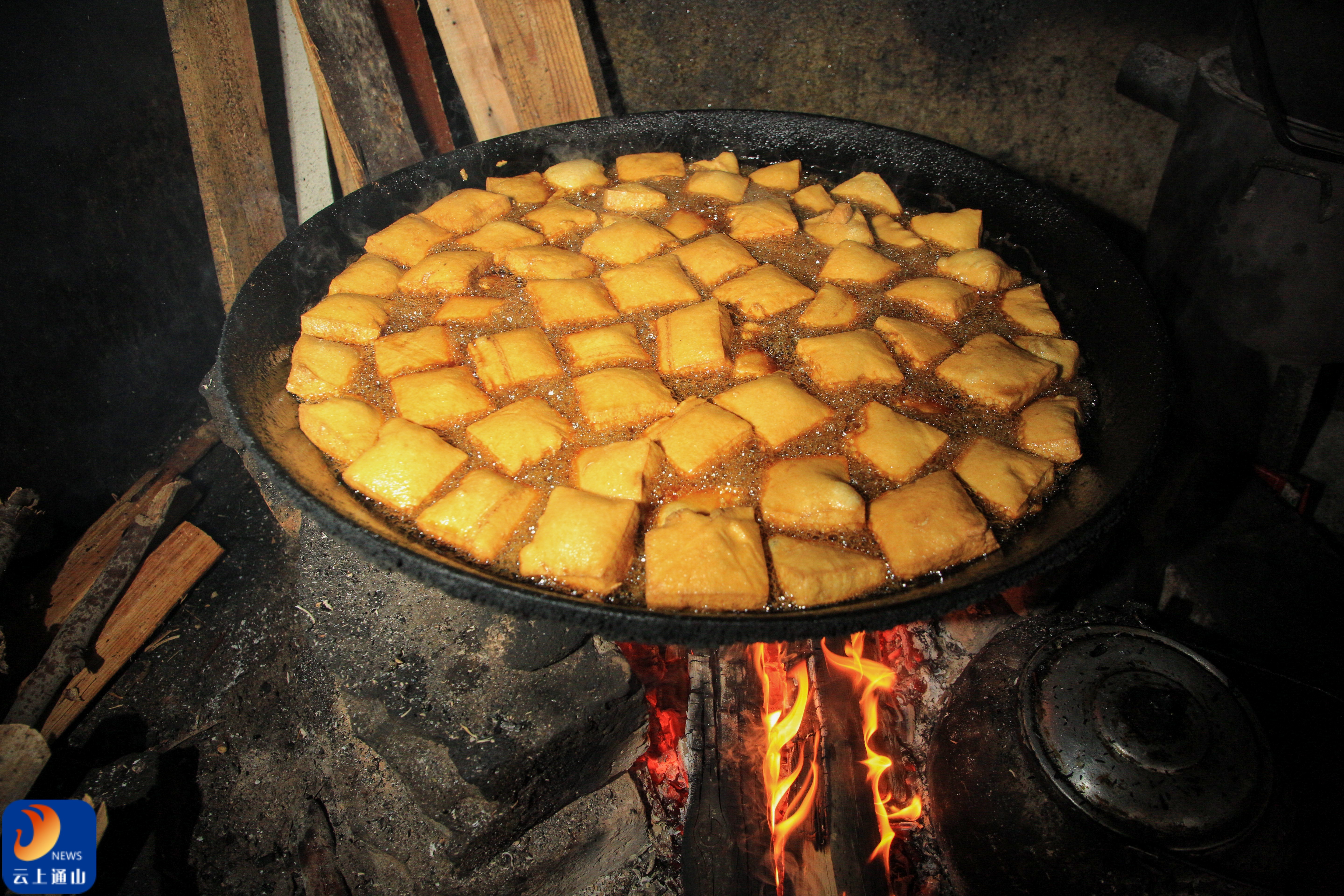 ▲铁锅炸制金黄油干,竹匾码放待炸的豆腐块,柴火映红了整个灶房。
