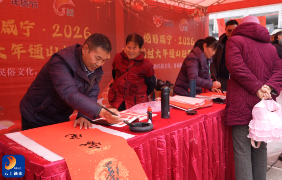 年货展销区内同样热闹非凡、购销两旺。米糕、包坨等通山传统手工美食飘香四溢;农副产品、新鲜果蔬、传统糕点琳琅满目;年画、剪纸、对联等民俗文化年货摆列整齐。特色产品售卖区前更是排起了长队,市民游客围站摊位前精心挑选本土好物,现场烟火气十足,年味浓郁。