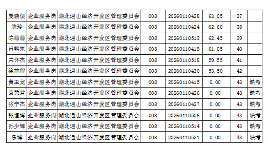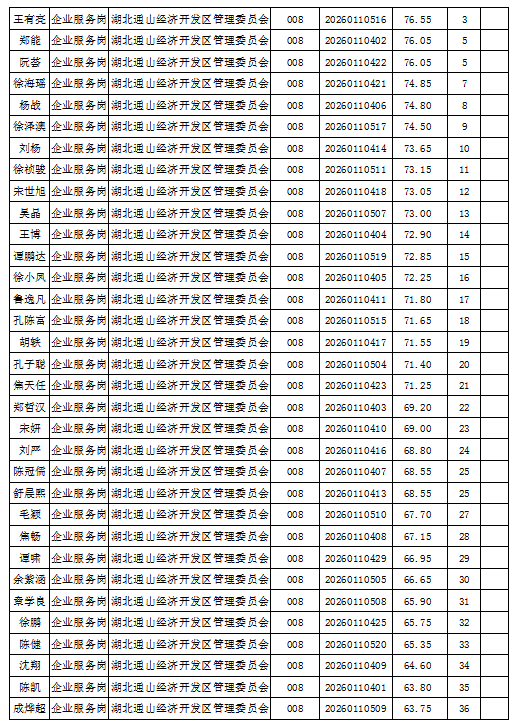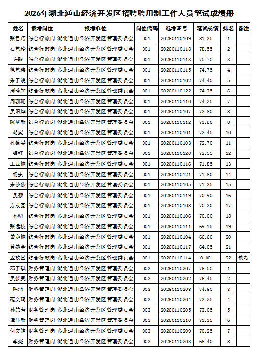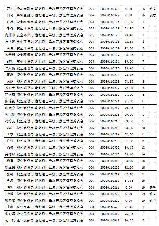 根据《2026年湖北通山经济开发区招聘聘用制工作人员工作方案》,现将2026年湖北通山经济开发区招聘聘用制工作人员的笔试成绩予以公示。如有疑议,请在2026年2月6日前到通山县人社局人事考试院反映情况,联系电话:0715-2880079。 资格复审和面试拟于本周进行,请相关考生提前做好准备工作并保持通讯畅通。 湖北通山经济开发区管理委员会 2026年2月2日 (编辑:杨越 二审:唐成 终审:阮班新)