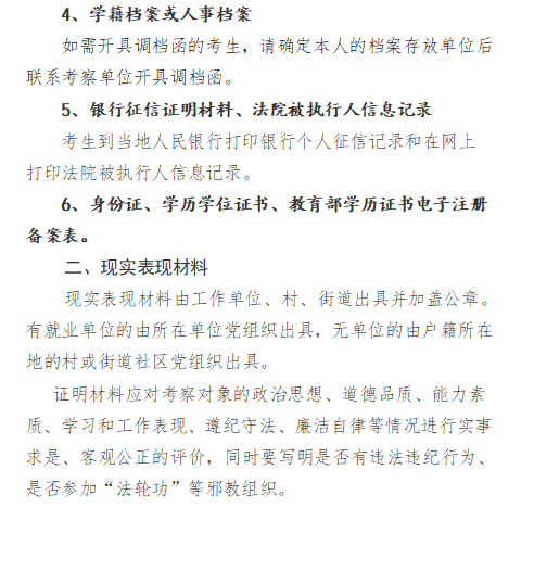 2、进入考察的考生须提供本人学籍档案,有工作经历的须提供人事档案。考生参加考察时需携带身份证、准考证、毕业证(学位证)、个人学籍档案、无犯罪记录证明等,按规定期限参加考察;不按期参加考察的考生,视为自动放弃考察资格。考察材料逾期未提交者,取消其聘用资格。