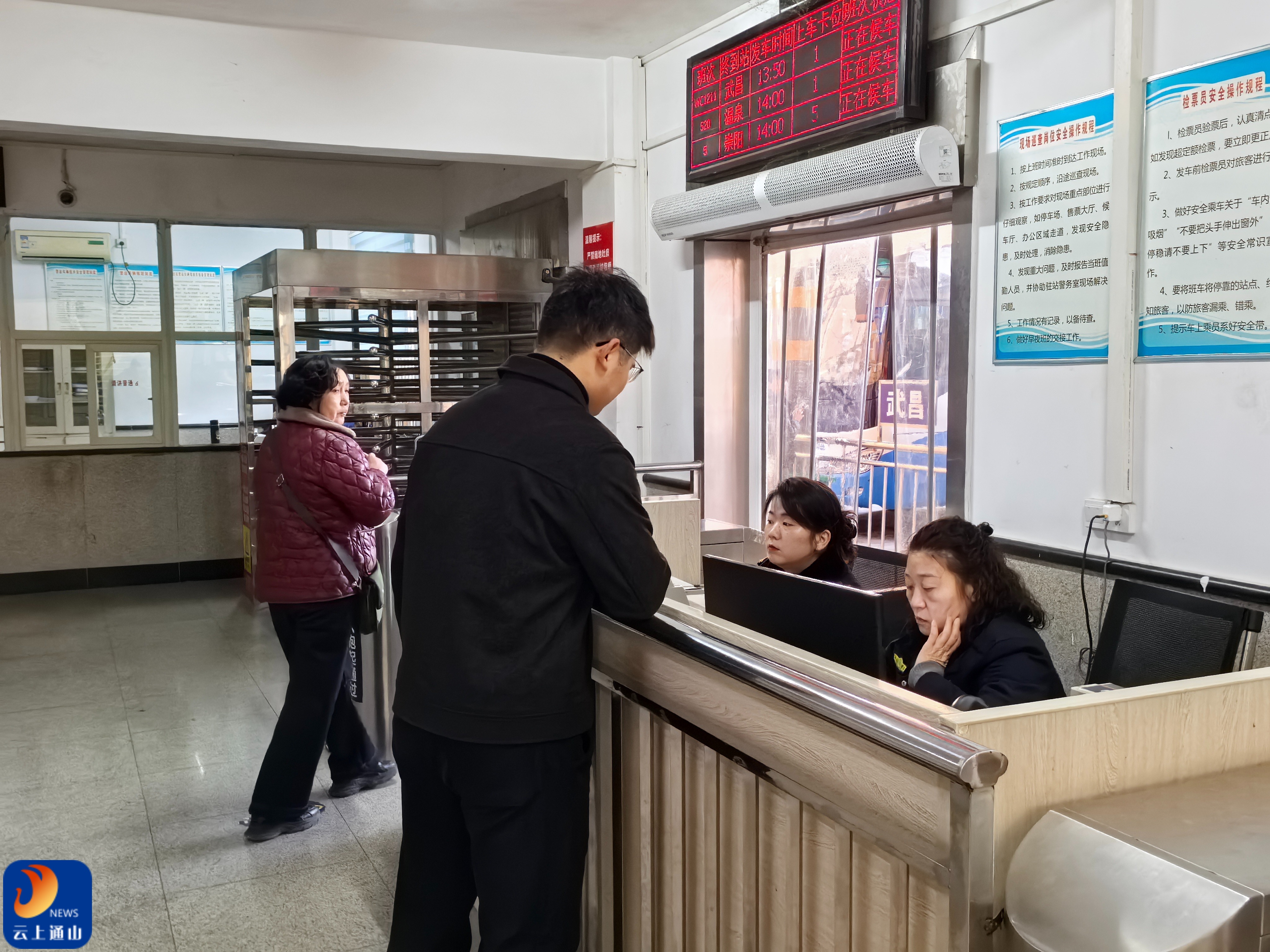 县中心客运站里,首班车驾驶员正在进行发车前的车辆检查;调度室内,值班人员紧盯屏幕,实时关注客流变化;售票窗口前,工作人员早早到岗,准备迎接一天中最繁忙的时刻。候车大厅里,身穿制服的工作人员穿梭在人群中,引导旅客有序进站、安检、候车;发车区内,志愿者帮助搬运行李的身影随处可见。对于奔阳公司的员工来说,春节假期从来不是休息,而是一场需要全力以赴的“大考”。