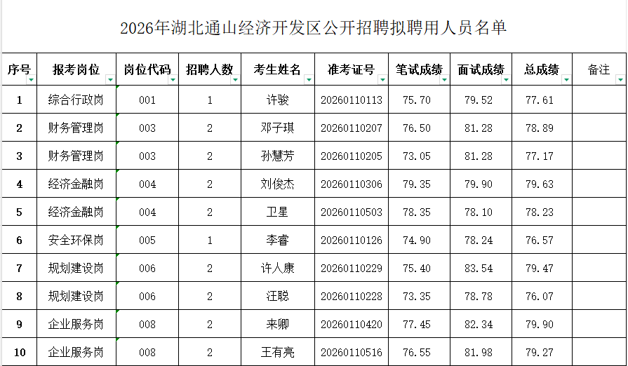 根据《2026年湖北通山经济开发区招聘聘用制工作人员工作方案》规定,经笔试、面试、体检、考察,确定拟聘用人员10名,现将名单予以公示。公示期为:2026年3月9日至2026年3月13日。公示期间,如有疑议,请向湖北通山经济开发区管委会反映。