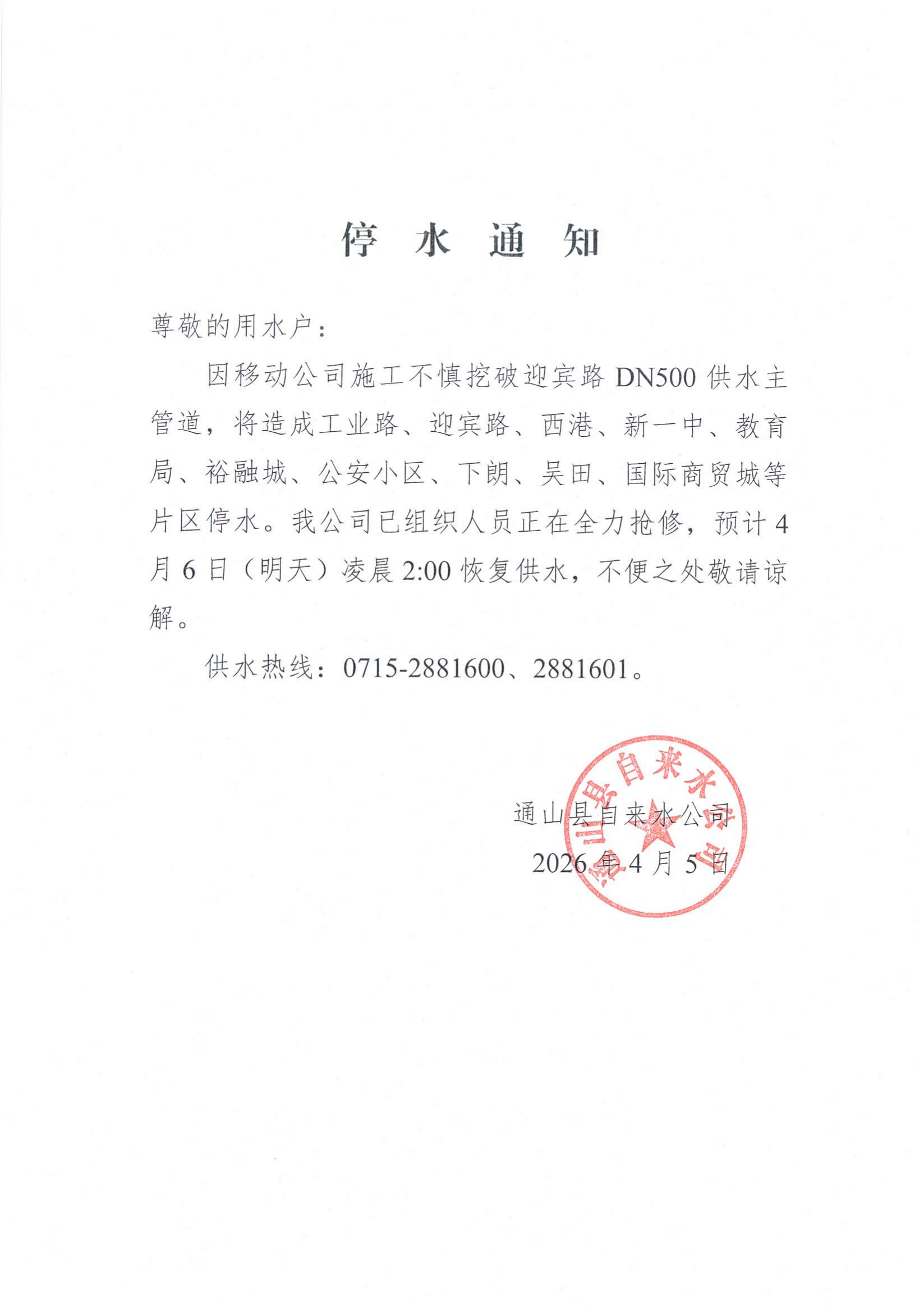 尊敬的用水户: 因移动公司施工不慎挖破迎宾路DN500供水主管道,将造成工业路、迎宾路、西港、新一中、教育局、裕融城、公安小区、下朗、吴田、国际商贸城等片区停水。我公司已组织人员正在全力抢修,预计4月6日(明天)凌晨2:00恢复供水,不便之处敬请谅解。 供水热线:0715-2881600 0715-2881601 通山县自来水公司 2026年4月5日 (编辑:张媛 二审:唐成 终审:阮班新)